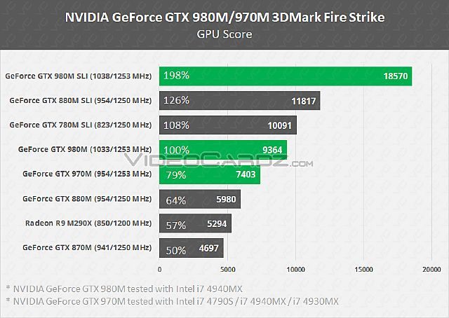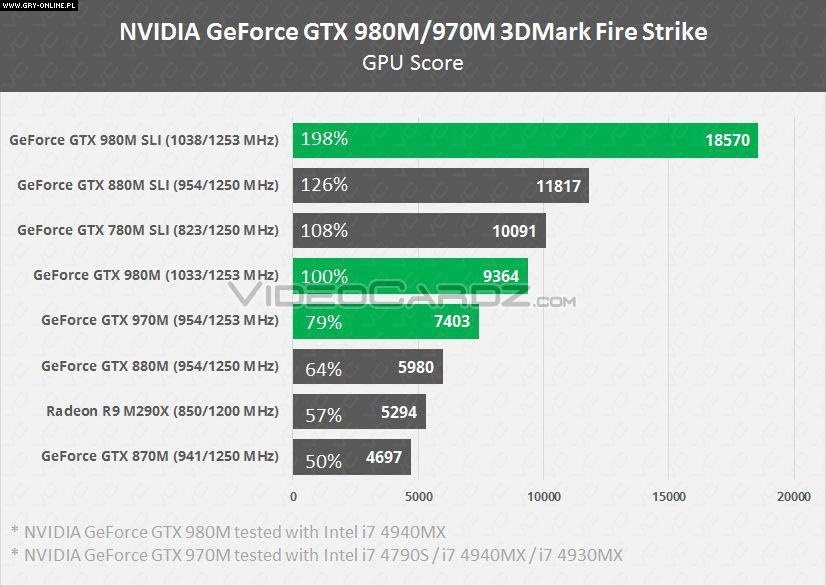 Jeśli chodzi o platformy mobilne, to karta GeForce GTX 980M, wyposażona w 8 GB pamięci, okazuje się aż o 56% szybsza od GTX 880M. Co więcej, nawet pojedynczy egzemplarz nieznacznie ustępuje wydajnością dwóm kartom GeForce 780M działającym w trybie SLI. Co ciekawe, łączenie dwóch kart GeForce GTX 980 jest dużo bardziej wydajne w przypadku wersji mobilnych, dając praktycznie dwukrotny wzrost wydajności, co praktycznie deklasuje pozostałe karty w zestawieniu.