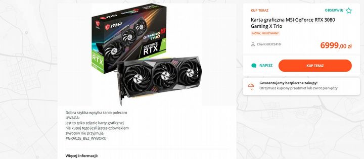 Nasuwa się jednak podejrzenie, że wcale niemały odsetek tych aukcji to nie tyle walka ze spekulantami, co liczenie na naiwność nabywców. Zdjęcia te sprzedawane są po „atrakcyjnej” cenie w porównaniu z innymi ofertami, przez co trafi na nie każdy szukający najtańszej opcji kupna nowych kart grafiki. Oczywiście zwykle wystarczy rzut oka do opisu, by dowiedzieć się, co jest przedmiotem aukcji. Biorąc jednak tempo znikania kolejnych dostaw GeForce’ów RTX 3000, trudno się dziwić, że niektórzy nie tracą czasu na tak drobne, ale istotne szczegóły. Fakt, że w wielu przypadkach sprzedawcy zapominają o komunikacie odnośnie walki z botami, ale pamiętają o poinformowaniu o braku zwrotów, mówi sam za siebie.
