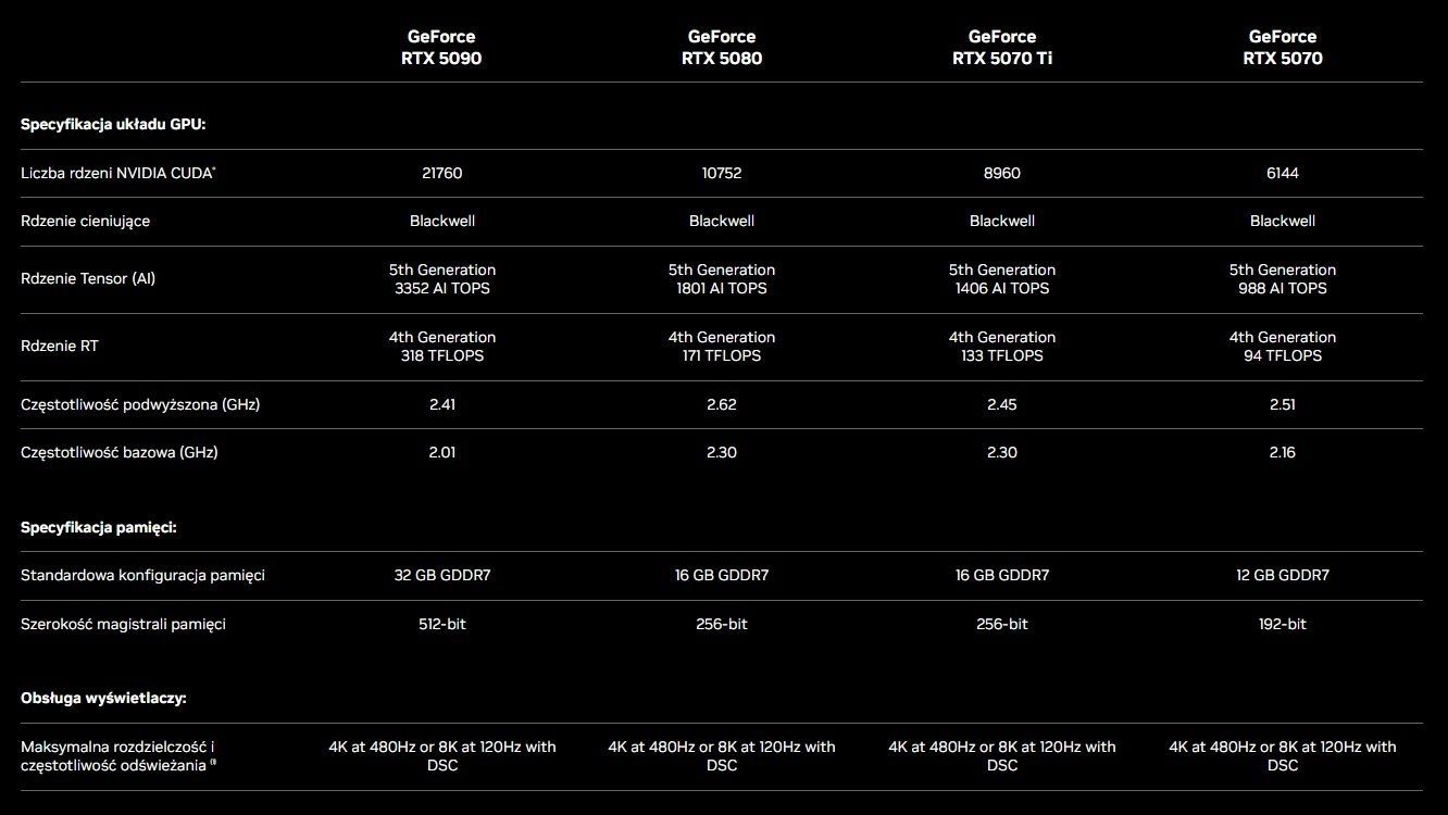 W chwili pisania tych słów znamy oficjalną specyfikację techniczną czterech kart graficznych z serii GeForce RTX 5000. Prezentuje się ona następująco: