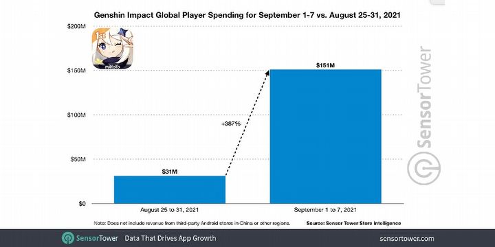 Prędkość, z jaką firma miHoYo wypuszcza kolejne aktualizacje do gry Genshin Impact, jest godna podziwu. Po ogromnym patchu 2.0, który został wydany pod koniec lipca, zapowiedziano łatkę 2.1; ta – zgodnie z planem – zadebiutowała 1 września. Zaledwie po siedmiu dniach od jej premiery chińskie studio mogło pochwalić się przychodem rzędu 151 milionów dolarów (około 580 milionów złotych). Według serwisu Sensor Tower, który opublikował te dane, jest to niemal czterokrotnie większa kwota niż 31 milionów „baksów” wygenerowanych przez grę w ostatnim tygodniu sierpnia. Statystykę obrazuje poniższy wykres.