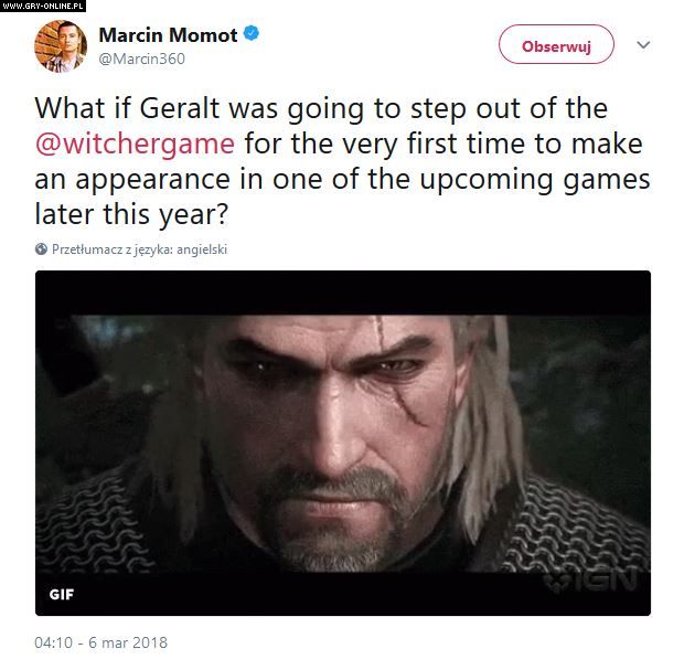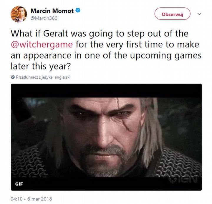 Marcin Momot zasugerował na Twitterze, że Geralt, czyli główny bohater serii książek i gier Wiedźmin, pojawi się w tym roku w jakiejś grze niezwiązanej z popularnym cyklem CD Projekt RED. Nie wiadomo na razie, o jaką produkcję może chodzić, ale mocnym kandydatem wydaje się bijatyka Soulcalibur VI.