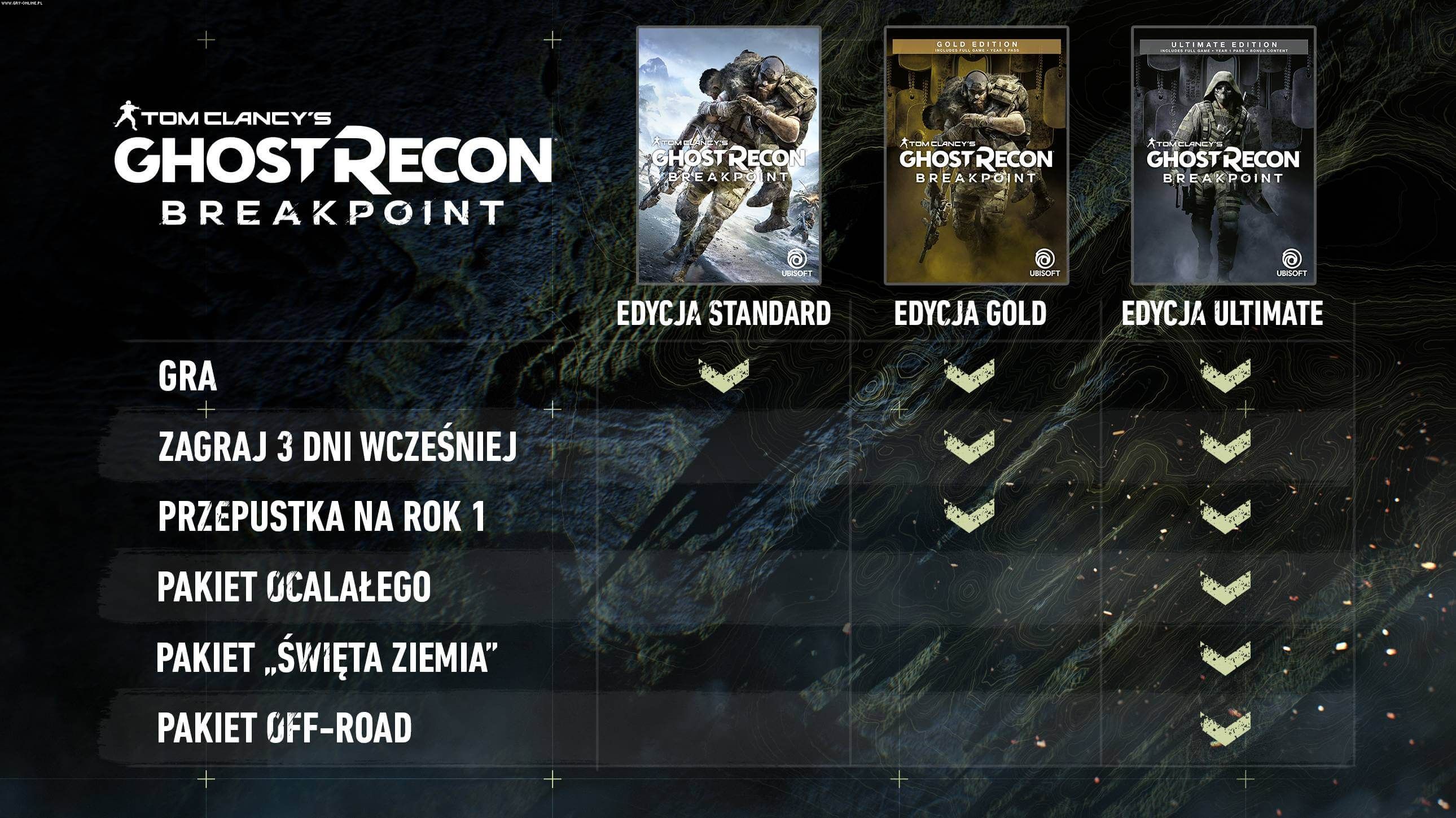 Ghost Recon: Breakpoint można już zakupić w przedsprzedaży. Cena standardowej edycji na PC w Epic Games Store wynosi 249,99 zł. Wersja Gold, zawierająca roczną przepustkę i wczesny dostęp (trzy dni przed posiadaczami wersji standardowej), kosztuje 399,90 zł. Za najdroższą edycję Ultimate zapłacimy 439,90 zł. W jej skład wchodzi wszystko to, co posiada Gold, plus dodatkowo: zestaw survivalowy, misja Sacred Land i zestaw offroadowy.