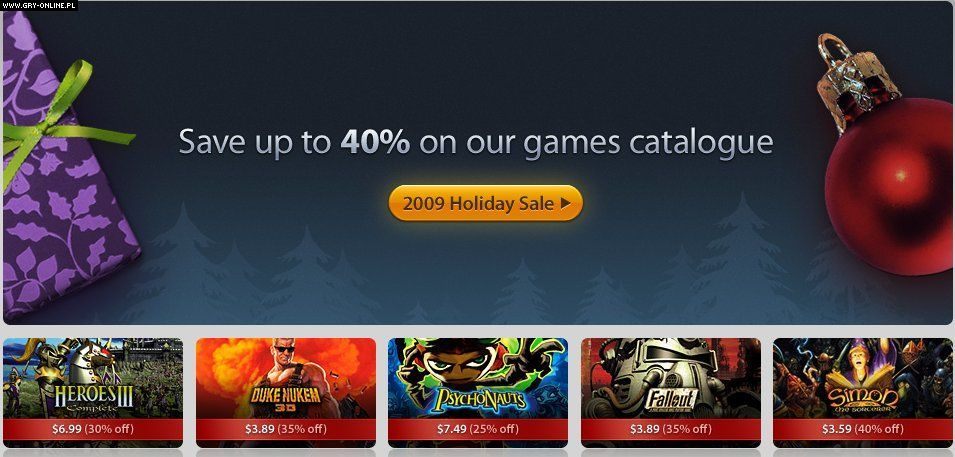 Wyprzedaż świąteczna GOG.com została ogłoszona wczoraj popołudniu na oficjalnej stronie sklepu. Jest to największa tego typu akcja w historii serwisu i dotyczy praktycznie wszystkich produktów w katalogu (wyłączając z tego gry dodane w grudniu). Obniżki są spore i sięgają od 25% do 40% w zależności od tytułu. Promocja potrwa do 3 stycznia przyszłego roku.