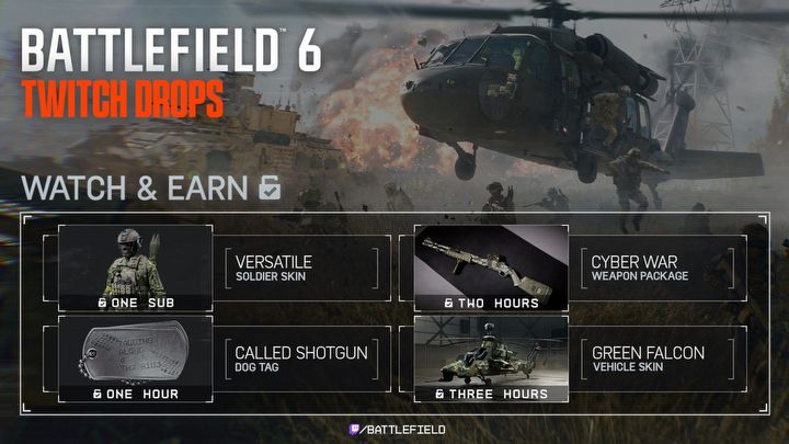 Od godziny 17:00 10 października do godizny 20:59 17 października można zdobyć nagrody w postaci skórek, nieśmiertelnika i pakietu broni. Wystarczy połączyć swoje konto EA z kontem serwisu Twitch i oglądać streamy z Battlefielda 6 u wybranych twórców. Pierwsza nagroda jest za subskrypcję, druga za oglądanie streama przez 60 minut, a trzecia i czwarta po każdej kolejnej godzinie śledzenia transmisji.
