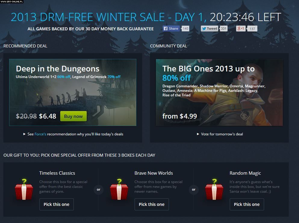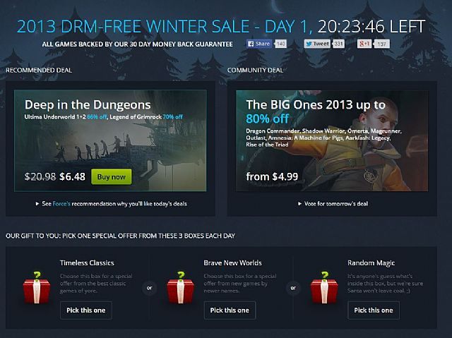 W serwisie GOG.com rozpoczęła się właśnie zimowa wyprzedaż gier. Wszystkie tradycyjnie udostępniane są graczom bez żadnych zabezpieczeń DRM, a sklep dodatkowo gwarantuje zwrot pieniędzy niezadowolonym klientom. Każdego dnia w ofercie będą pojawiać się nowe promocje, a także specjalne paczki tematyczne oraz zniżki zaproponowane przez osoby znane z gamingowych programów w serwisie YouTube. Gracze będą mieli okazję wybrać również własny upust, decydując czy dotyczyć będzie on klasyków czy też nowych gier w ofercie witryny.
