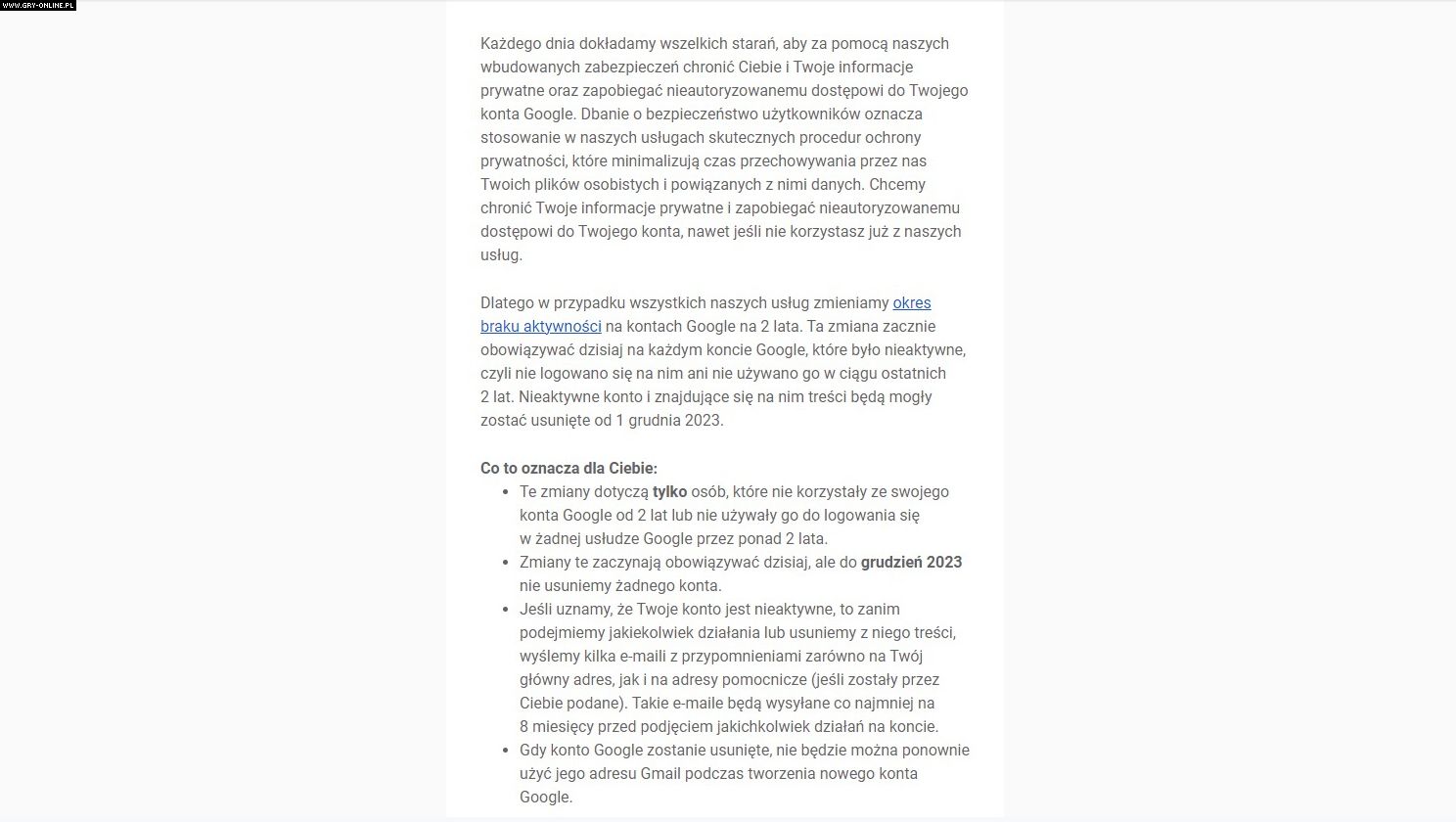 Firma uprzedza, że choć zmiana weszła już w życie, to pierwsze konta zaczną być usuwane wraz ze znajdującymi się na nich treściami już od 1 grudnia bieżącego roku. Nie można też zapomnieć, że to samo dotyczy konta na YouTube, gdyż usługi są ze sobą połączone, więc oznacza to nie tylko stratę wszystkich wiadomości, ale również opublikowanych filmów.