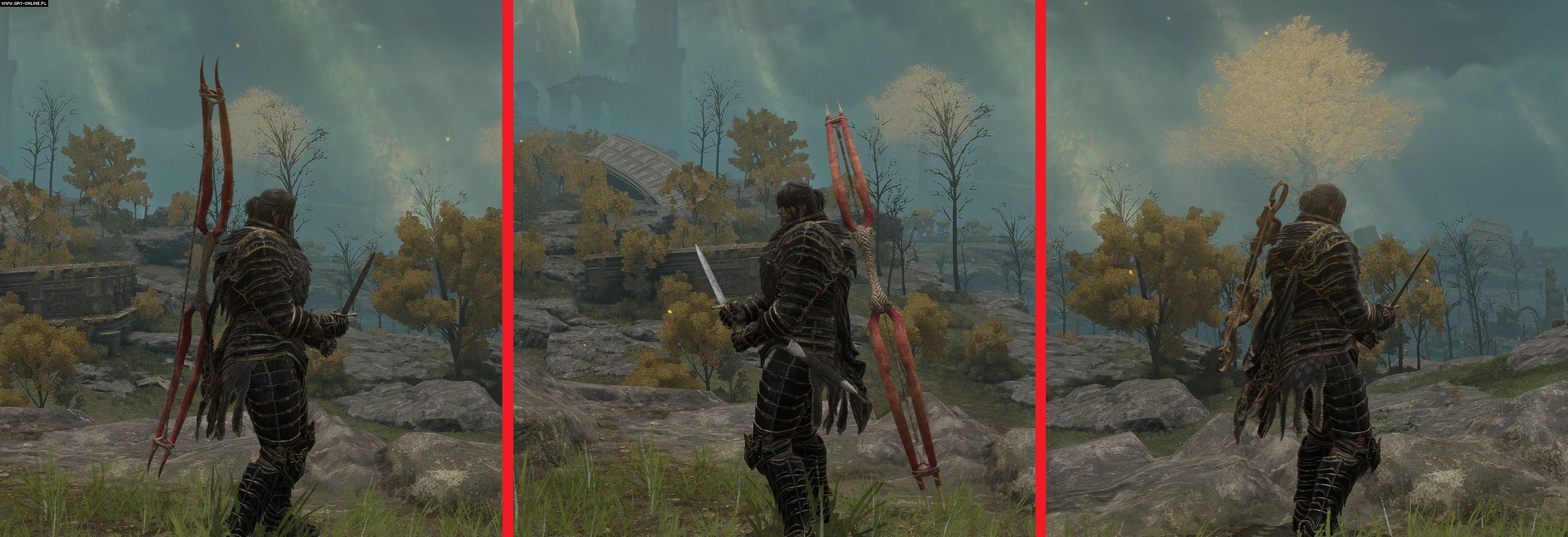 Niemniej jedne gry prezentują to lepiej niż inne. W Elden Ring łuk wprawdzie lewituje, ale jeśli się przyjrzymy, zauważymy, iż łęczysko znajduje się bliżej pleców protagonisty niż cięciwa – co sugeruje, że na czymś się jednak trzyma.