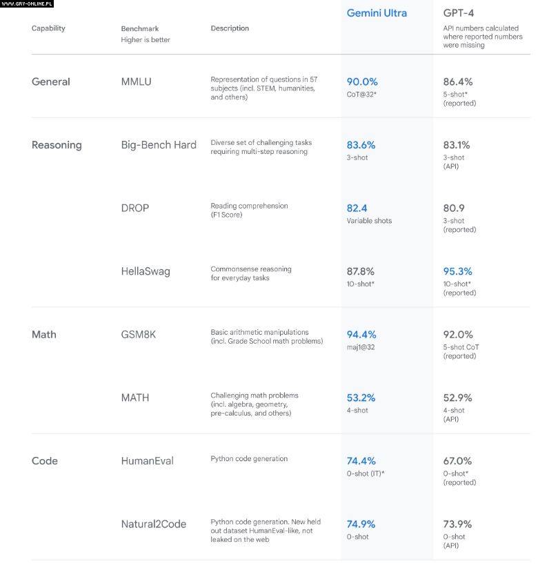 Pierwsza z wymienionych sztucznych inteligencji według zapewnień twórców ma osiągać najwyższe wyniki w 30 na 32 testach, porównujących wydajność AI. Poniżej znajduje się porównanie wyników Gemini oraz ChatGPT 4.