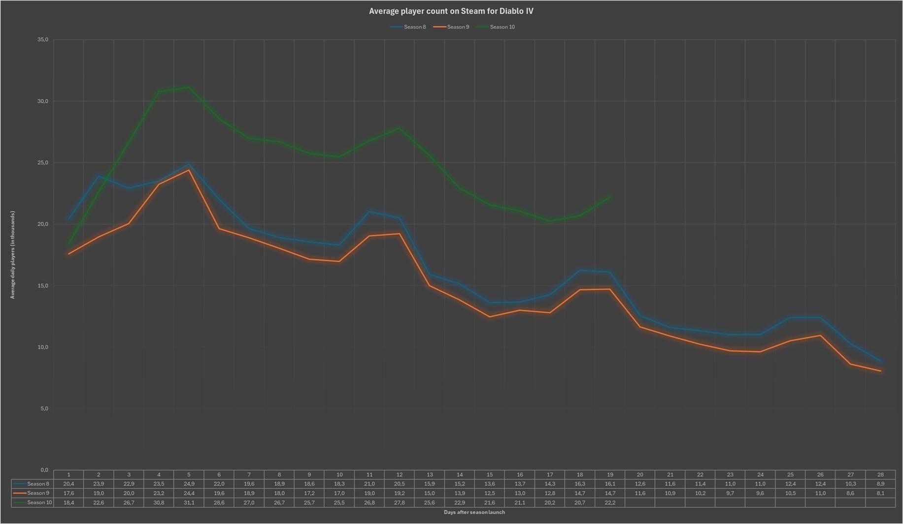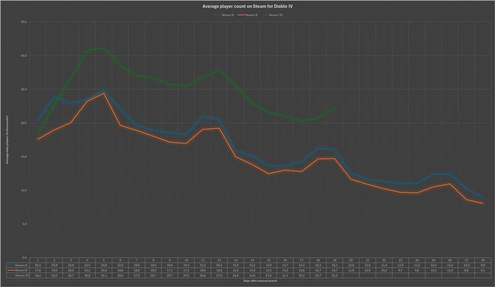 Sezon Piekielnego Chaosu zadebiutował 3 tygodnie temu, a mimo to wciąż cieszy się bardzo dużą aktywnością graczy, czego dowodzą statystki. Redditor znany jako „CulturalNinja6” na subbredicie r/diablo4 podzielił się swoim dość ciekawym spostrzeżeniem. Mianowicie, zerkając na stronę SteamDB można zauważyć, że 10. sezon Diablo 4 radzi sobie znacznie lepiej względem dwóch poprzednich w kwestii zaangażowanych w rozgrywkę graczy na przestrzeni pierwszych tygodni po premierze aktualizacji. Redditor wyciągnął dane z ostatnich sezonów i porównał je z obecnym. Na załączonym poniżej wykresie jasno widać różnice w kwestii aktywności.