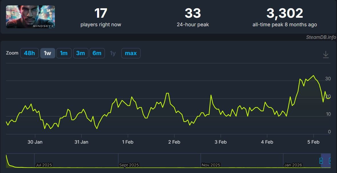 No właśnie, bo chociaż deweloperzy pracują w pocie czoła, aby uratować MindsEye, gra wywołuje bardzo małe zainteresowanie. Według SteamDB w ciągu ostatnich 24 godzin w szczytowym momencie bawiły się w niej jedynie 33 osoby jednocześnie. A zaznaczmy, że jesteśmy świeżo po wydaniu „największej” dotychczasowej aktualizacji.