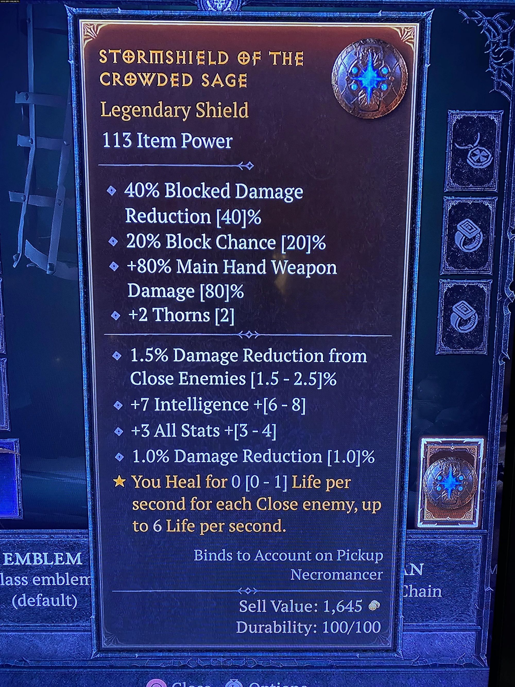 Po wielu godzinach i walce z rzadkim Rzeźnikiem (Butcher) udało mu się zdobyć Boneweave Helm z legendarnym afiksem Aspect of the Crowded Sage. To wzmocnienie leczy bohatera za każdego pobliskiego wroga, co znacznie ułatwia przetrwanie (choć w tzw. „endgame” nie jest już aż tak przydatne).