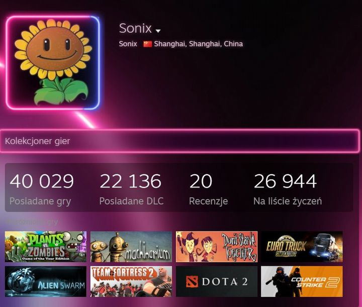 Zgodnie z profilem na Steamie, użytkownik o pseudonimie Sonix ma w tym momencie dokładnie 40 029 tytułów, na które składają się zarówno płatne, jak i darmowe dzieła. Do tego doliczmy jeszcze 22 136 DLC, a także aż 26 944 pozycji na liście życzeń. Zarejestrowany w Szanghaju (Chiny) gracz najwięcej czasu spędził przy Alien Swarm – tej darmowej, kooperacyjnej produkcji poświęcił już 551 godzin.