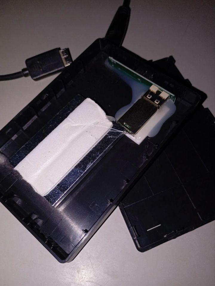 To, co zobaczył w środku, zszokowało go. Zamiast talerzy i głowic, charakterystycznych dla tradycyjnego dysku twardego (HDD), znalazł tam mały chip pamięci flash, podłączony do złącza USB za pomocą kilku przewodów. Dodatkowo, w obudowie umieszczono metalowy obciążnik, przyklejony taśmą dwustronną i zabezpieczony gąbką, aby imitować wagę prawdziwego dysku.