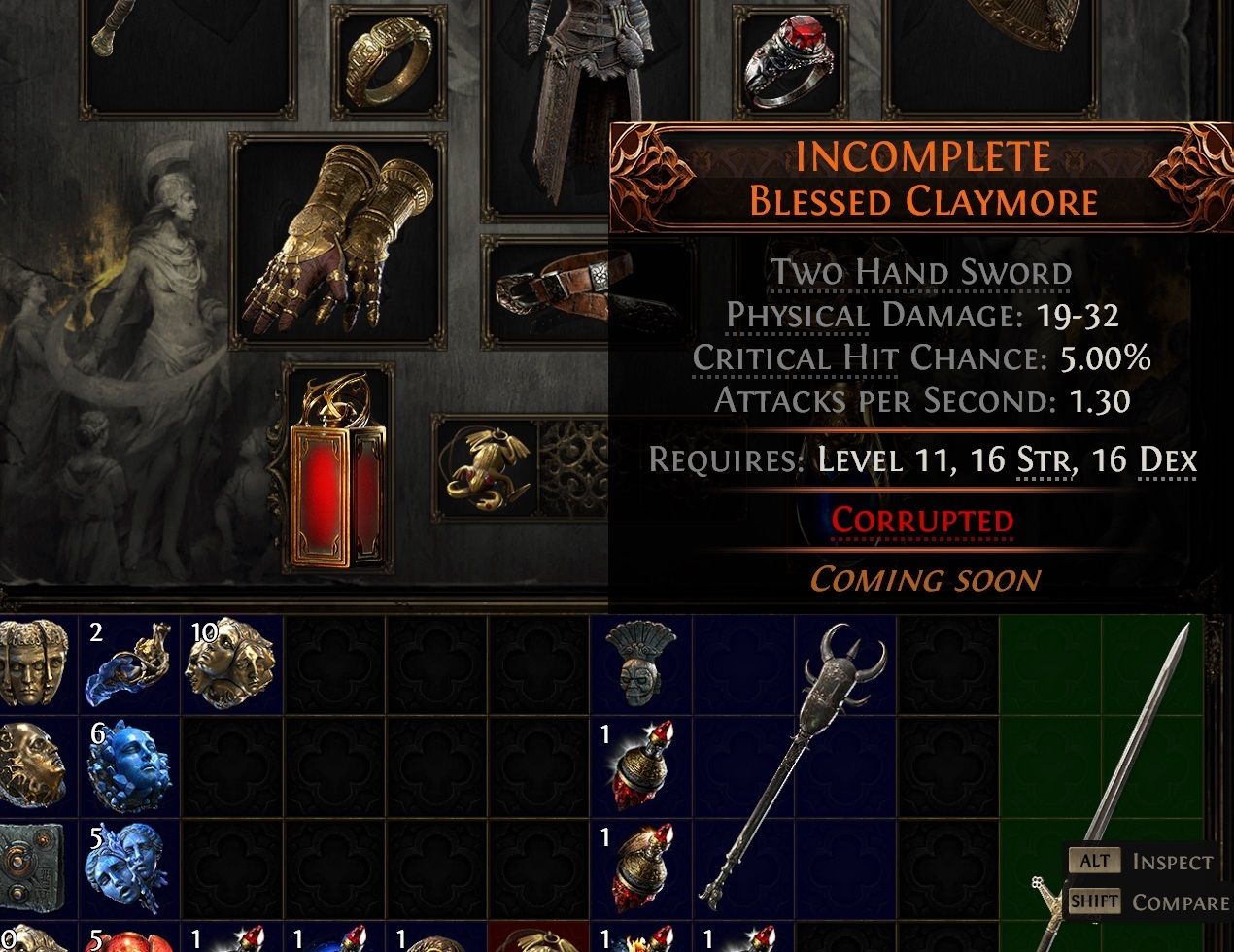 Na taki łup trafi internauta dazvolt, który pokazał swoją zdobycz zTrials of Chaos w wątku opublikowanym serwisie Reddit. Incomplete Blessed Claymore uwzględnia – poza statystykami, wymaganiami i wzmianką o jego „spaczeniu” – krótką informację: „już wkrótce” („coming soon”).