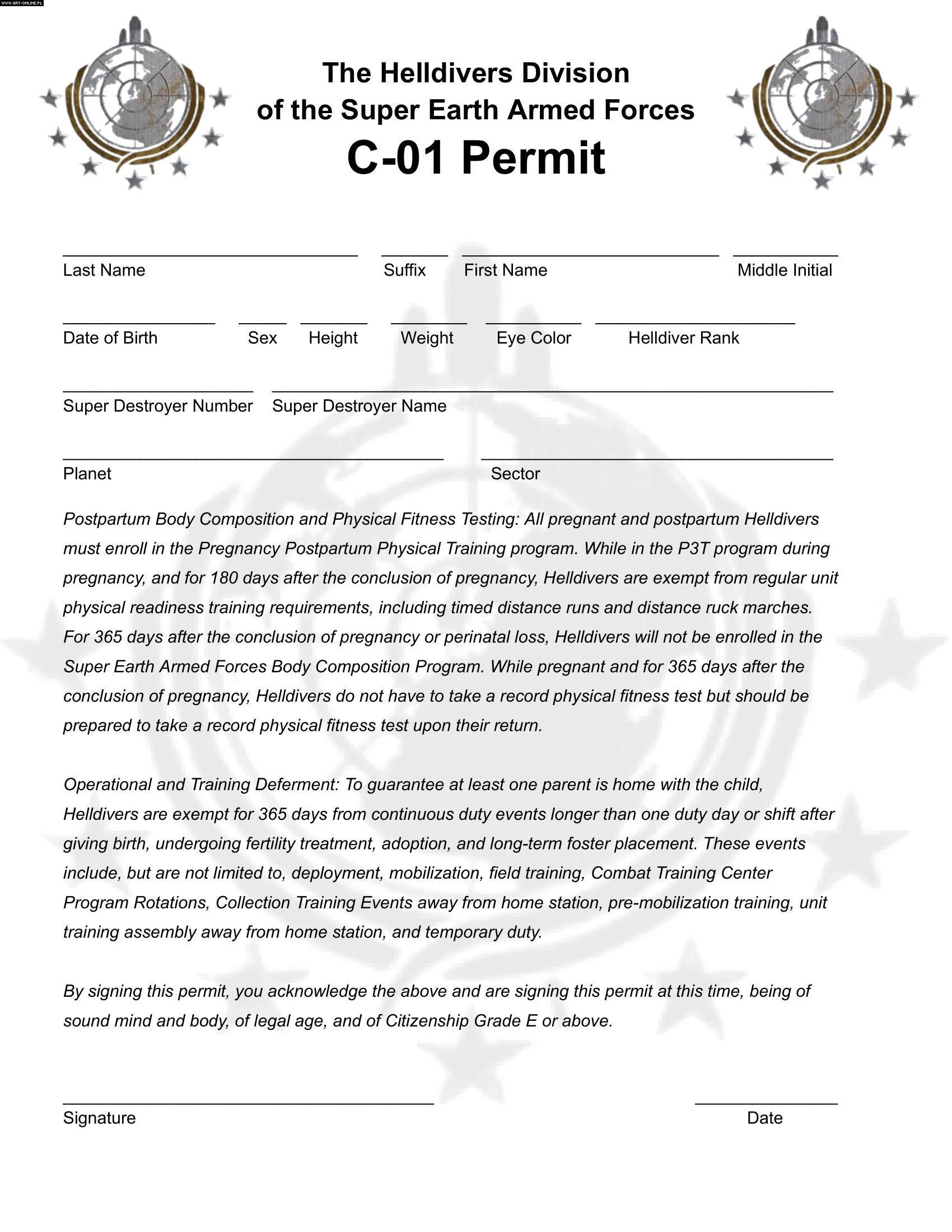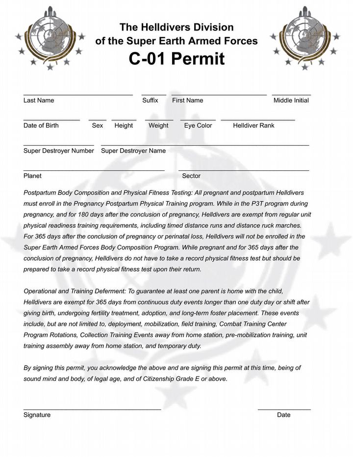 Rzeczony formularz to narzędzie kontroli populacji w świecie Helldivers 2. Zgodnie z prawem Demokracji Super Ziemi każdy, kto chce podjąć jakiekolwiek działania reprodukcyjne, ma obowiązek uzyskać takie pozwolenie.