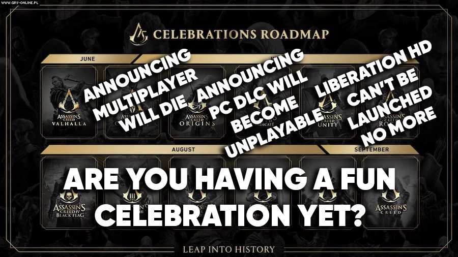 Od niedawna wiemy, że Ubisoft w tym roku pozbawi wsparcia sieciowego kilka odsłon serii Assassin’s Creed, w tym m.in. Liberation HD, czy Brotherhood. Tym, co dolało oliwy do ognia, jest bardzo niefortunny zbieg okoliczności, a mianowicie 15. urodziny serii Assassin’s Creed.