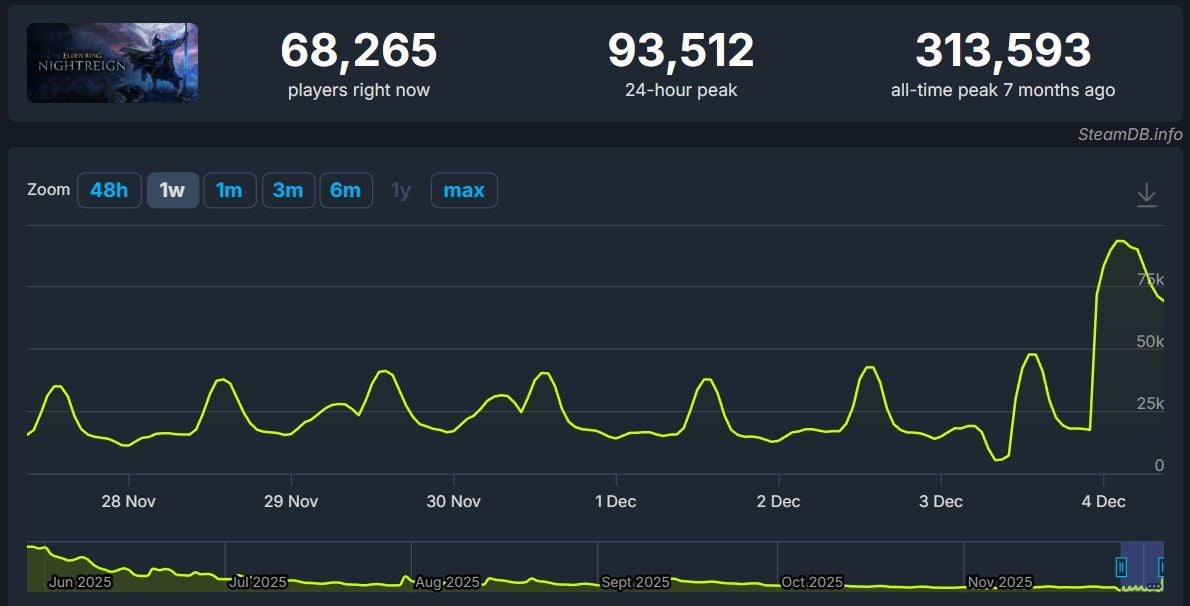 Premiera The Forsaken Hollows wyraźnie zwiększyła zainteresowanie Elden Ring: Nightreign, w którym w ciągu ostatnich 24 godzin w szczytowym momencie bawiło się ponad 90 tysięcy graczy jednocześnie. Wynikowi temu daleko do premierowego rekordu, ale wzrost jest bez wątpienia zauważalny.