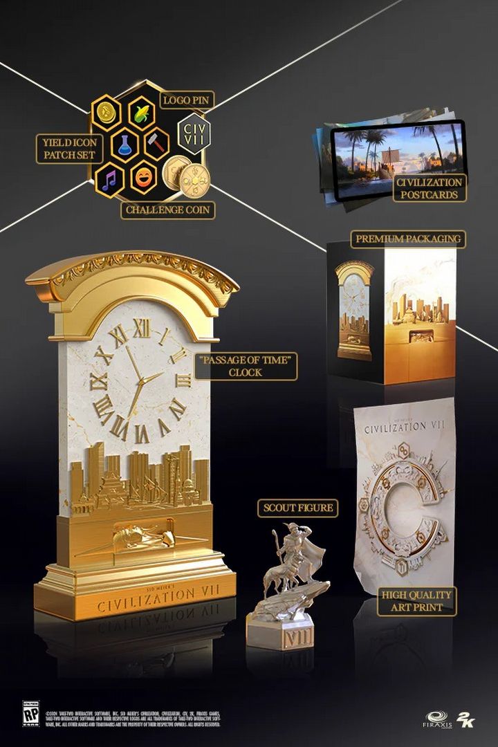 Oprócz bonusów „założycielskiego” wydania (czyli dostępu do DLC i cyfrowych bonusów) edycja kolekcjonerska uwzględnia m.in. dekoracyjny zegar, figurkę zwiadowcy z psem, przypinkę z logo gry oraz pocztówki. Wszystkie atrakcje „kolekcjonerki” Civilization 7 możecie zobaczyć na grafice, którą zamieściliśmy poniżej.