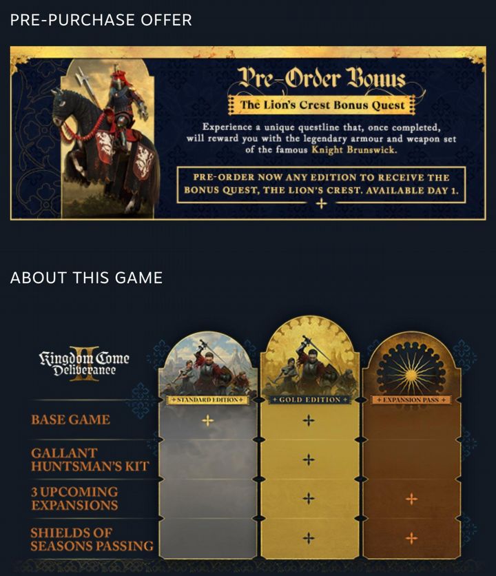 Na Redditcie rozgorzała z tej przyczyny dyskusja, w której dostało się debiutującemu dziś RPG-owi czeskiego studia Warhorse – Kingdom Come: Deliverence 2. Jak zauważył użytkownik vaikunth1991, przygody Henryka w ramach preordera standardowej wersji oferowały bowiem bonusową misję „Lwi Herb”, po której ukończeniu mogliśmy otrzymać pancerz rycerza Bruncvika.