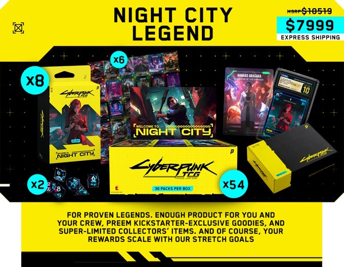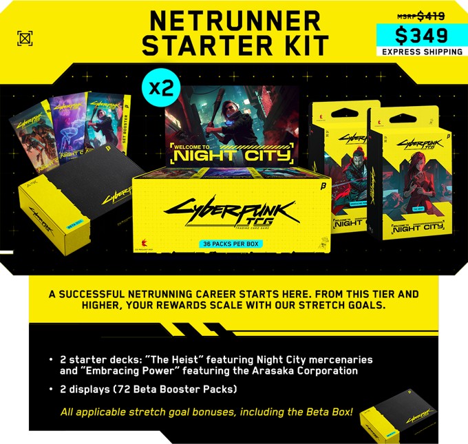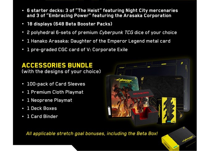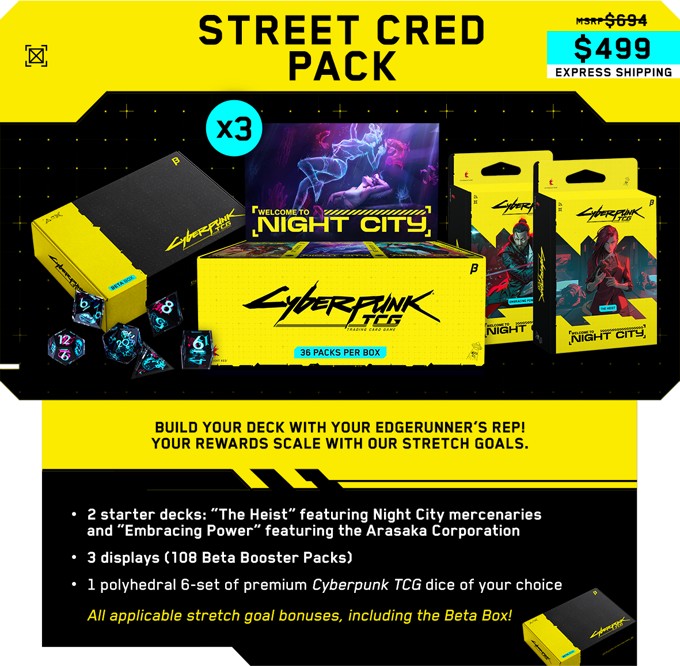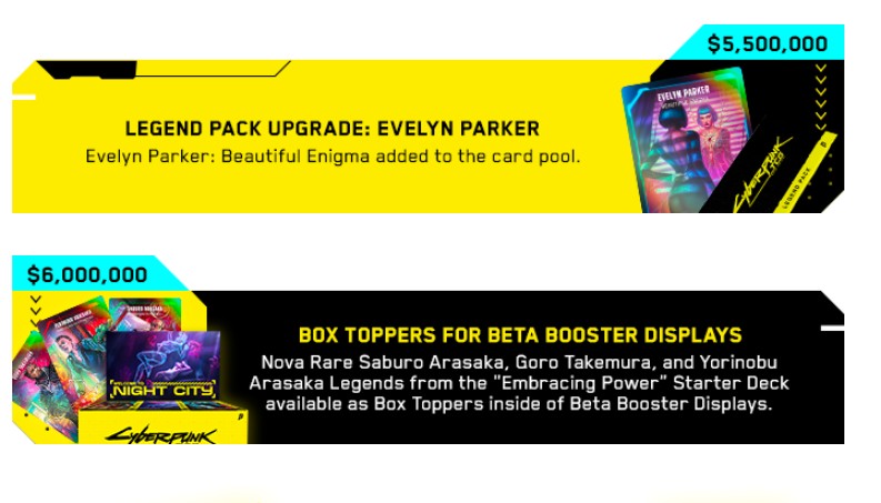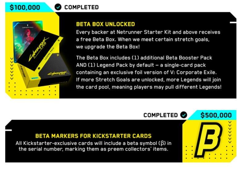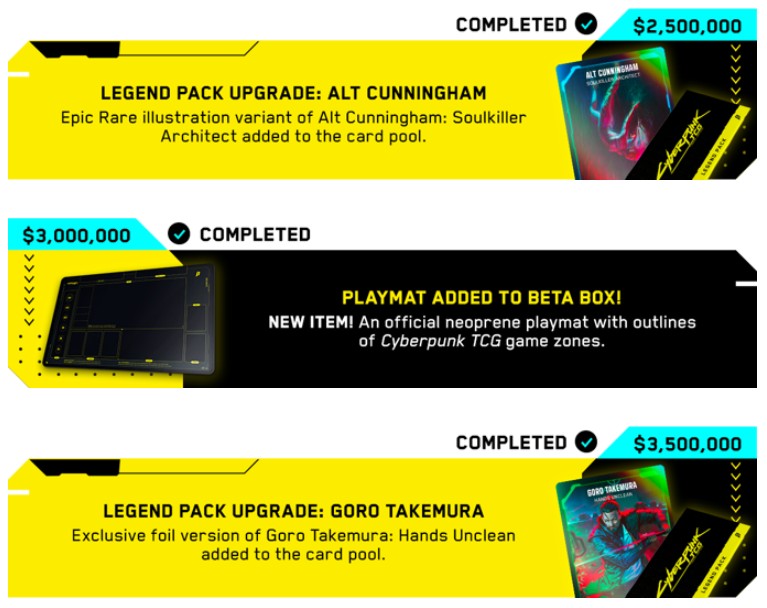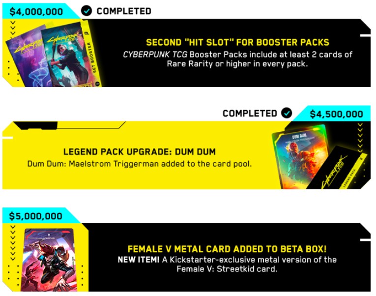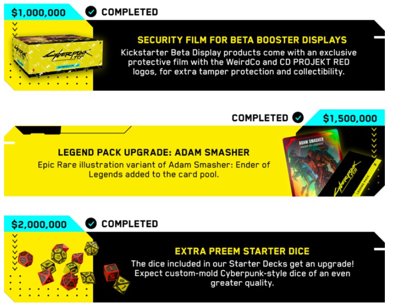 Twórcy kampanii przygotowali kilka progów do wypełnienia, z czego ostatni przedstawiony na stronie sięga na tę chwilę 6 milionów dolarów – wraz z postępem zbiórki pojawiają się kolejne. W ten sposób wspierający zapewnili sobie m.in. specjalnego Beta Boxa, oznakowanie „beta” na kartach oraz zestaw kości w cyberpunkowym stylu – a w kolejce czekają też np. legendarne wersje kart.