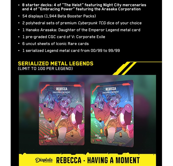 Warto również wspomnieć, że dostępnych jest kilka poziomów wsparcia, rozpoczynających się od 50 dolarów, a kończących na 7999 dolarach. Poza większą liczbą paczek z kartami zawierają one również limitowane przedmioty, które stanowią nie lada gratkę dla kolekcjonerów, takie jak np. jedna ze stu metalowych kart z Rebeccą z anime Cyberpunk: Edgerunners.