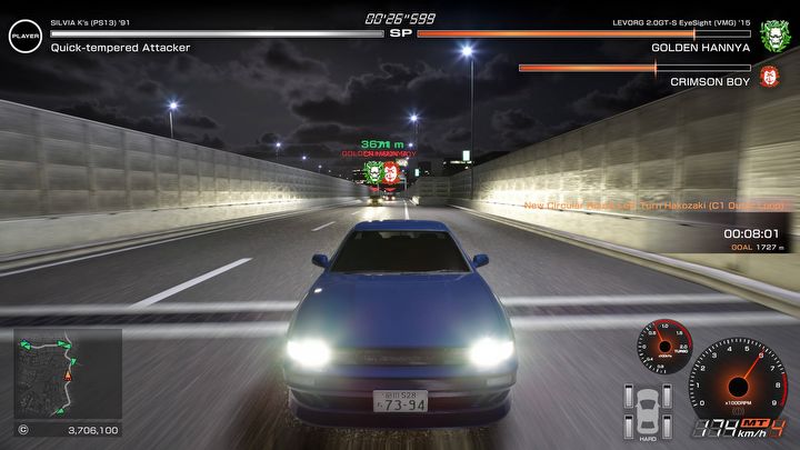Początek wygląda tak: wybieramy jeden z trzech samochodów (Mazda MX-5, Suzuki Swift, Toyota AE86) i po lakonicznym fabularnym wprowadzeniu już toczymy pierwszy pojedynek na ulicach śpiącego Tokio. A właściwie nie tyle ulicach, ile drogach szybkiego ruchu, które ciągną się przez setki kilometrów ponad dachami metropolii. Potem wysłuchujemy jeszcze jednej rozmowy – w zasadzie odczytujemy ją – i za chwilę gra już stoi przed nami otworem, zostawiając nas zdanych tylko na siebie.