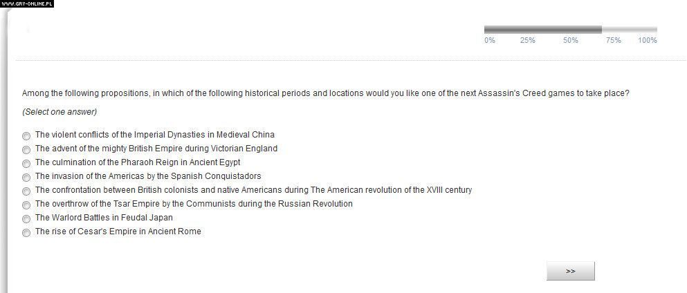 W sieci pojawił się screenshot z ankiety, która miała być przeprowadzona przez firmę Ubisoft. Gracze są w niej pytani o to, gdzie według nich miałaby toczyć sie kolejna odsłona cyklu gier Assassin's Creed.