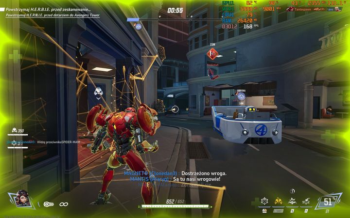 Trzeba oddać, że Marvel Rivals to produkcja, która odpali na dosłownie wszystkim, co nie jest starsze niż 10 lat. Dolny próg wymogów sprawia, że dosłownie każdy paroletni laptop bezproblemowo poradzi sobie z tymi wymaganiami. W przypadku mojego Acera nie miałem żadnych, ale to żadnych problemów z płynnością rozgrywki. Liczba klatek na maksymalnych ustawieniach w trakcie walk drużynowych oscylowała w graniach 110-130. Po zniżeniu ustawień do najniższych ta wartość wzrosła do 154-170 kl./s w zależności od ilości efektów na ekranie.