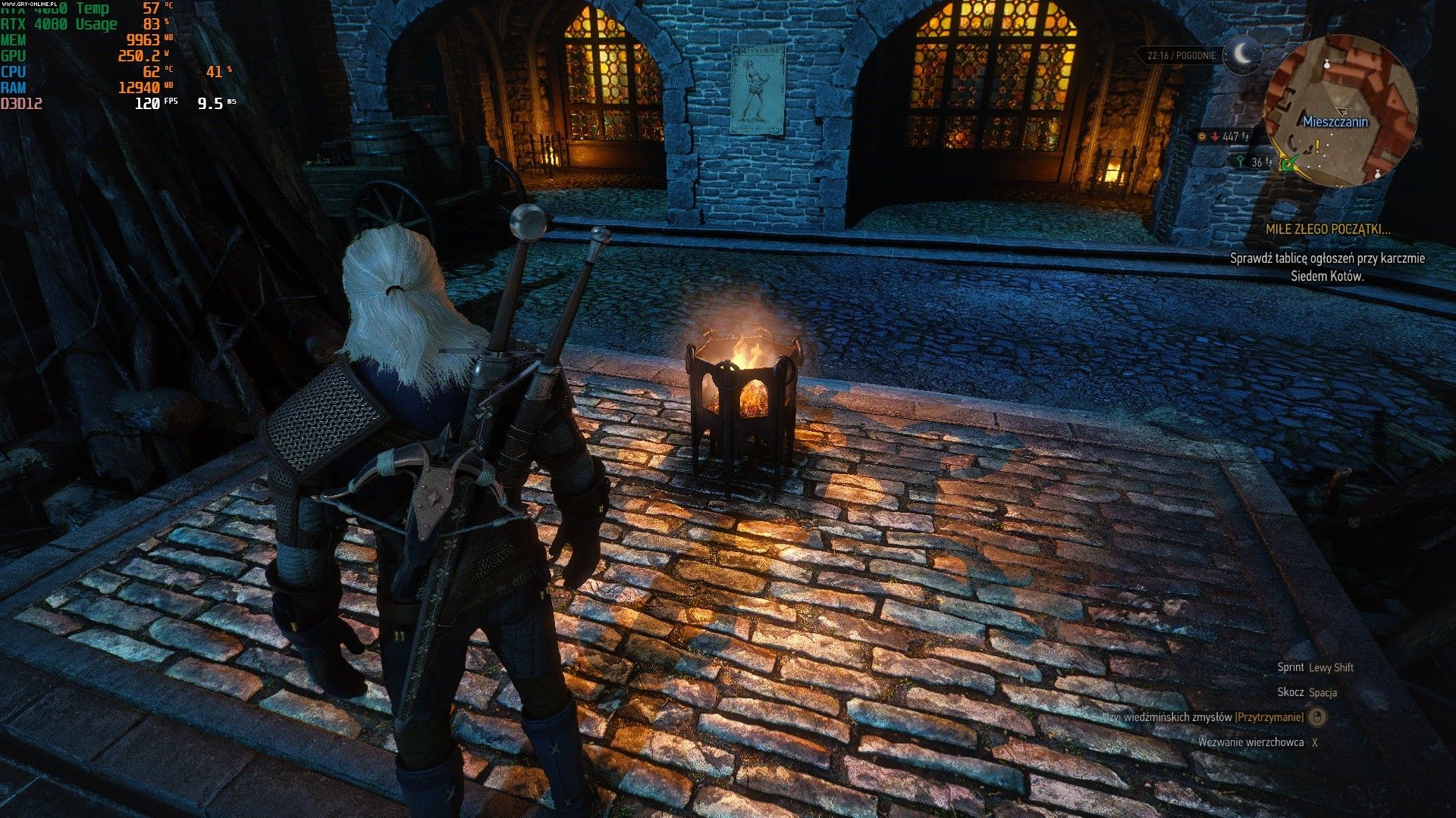 Wiedźmin 3 już w dniu premiery w 2015 roku wyglądał naprawdę dobrze, ale po wydaniu „next-genowego” patcha prezentuje się w zasadzie jak tytuł wydany w 2022 roku. Twórcy zawarli w nim tekstury w wysokiej rozdzielczości, ustawienia „Uber+”, ulepszyli mnóstwo drobnych elementów, zaimplementowali mody, ale przede wszystkim dodali ray tracing i wsparcie dla DLSS 3. W trakcie kilku godzin testów świat Wiedźmina znowu wessał mnie bez reszty, ładniejszy niż kiedykolwiek wcześniej. Zastosowanie RTXGI (RTX Global Illumination) spowodowało, że cały system globalnego oświetlenia skorzystał z dobrodziejstw śledzenia promieni i zyskał na naturalności. Mi do gustu przypadł szczególnie nowy system cieniowania z ray tracingiem, dzięki któremu gra nabrała dużo więcej głębi – nawet „papierowa” wcześniej trawa wygląda teraz znacznie lepiej. GeForce RTX 4080 w połączeniu z Core i5-13600K dostarczał na ustawieniach RT Ultra (z maksymalnym możliwym ray tracingiem) w rozdzielczości 1080p, w lokalizacji testowej (rynek w Novigradzie) około 60 klatek na sekundę.