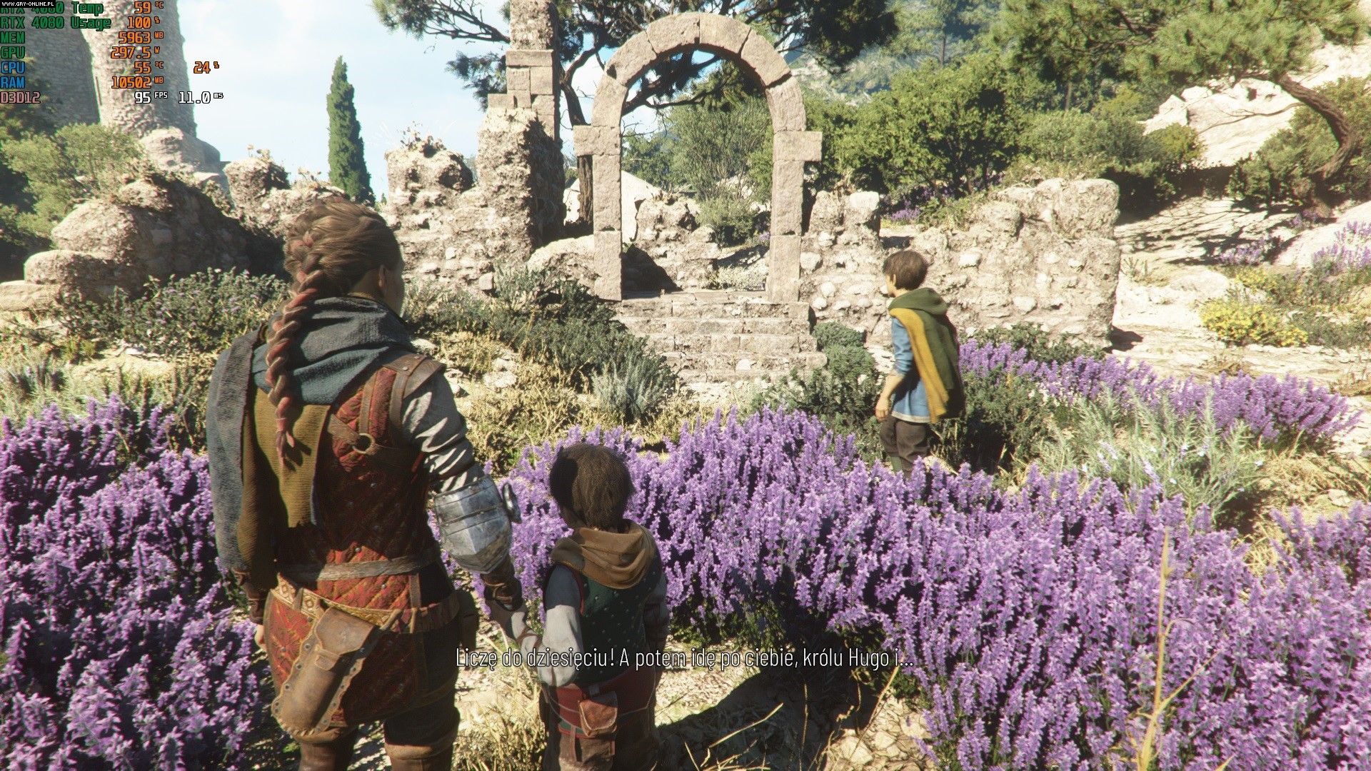 Wspominałem wcześniej, że A Plague Tale: Requiem działa na konsolach obecnej generacji w 30 klatkach na sekundę, co rozczarowało wielu graczy. Odpalając tytuł na komputerze liczyłem się z tym, że także tutaj może być dość ciężko (w końcu Wiedźmin 3 bez DLSS 3 osiągał około 60 fps-ów), ale rzeczywistość okazała się inna. W rozdzielczości 1080p A Plague Tale: Requiem działa na RTX-ie 4080 bez żadnej formy DLSS w około 90 klatkach na sekundę z włączonym ray tracingiem (w 4K było to nadal więcej niż 60 fps). Z gęstą roślinnością poruszaną przez wiatr i ostrymi jak brzytwa teksturami gra prezentuje się naprawdę ślicznie. Różnica w płynności w porównaniu do konsolowej wersji jest uderzająca, choć muszę przyznać, że w tego typu grze (skradance bez rozbudowanego systemu walki) nie przydaje się to tak bardzo, jak np. w Wiedźminie.