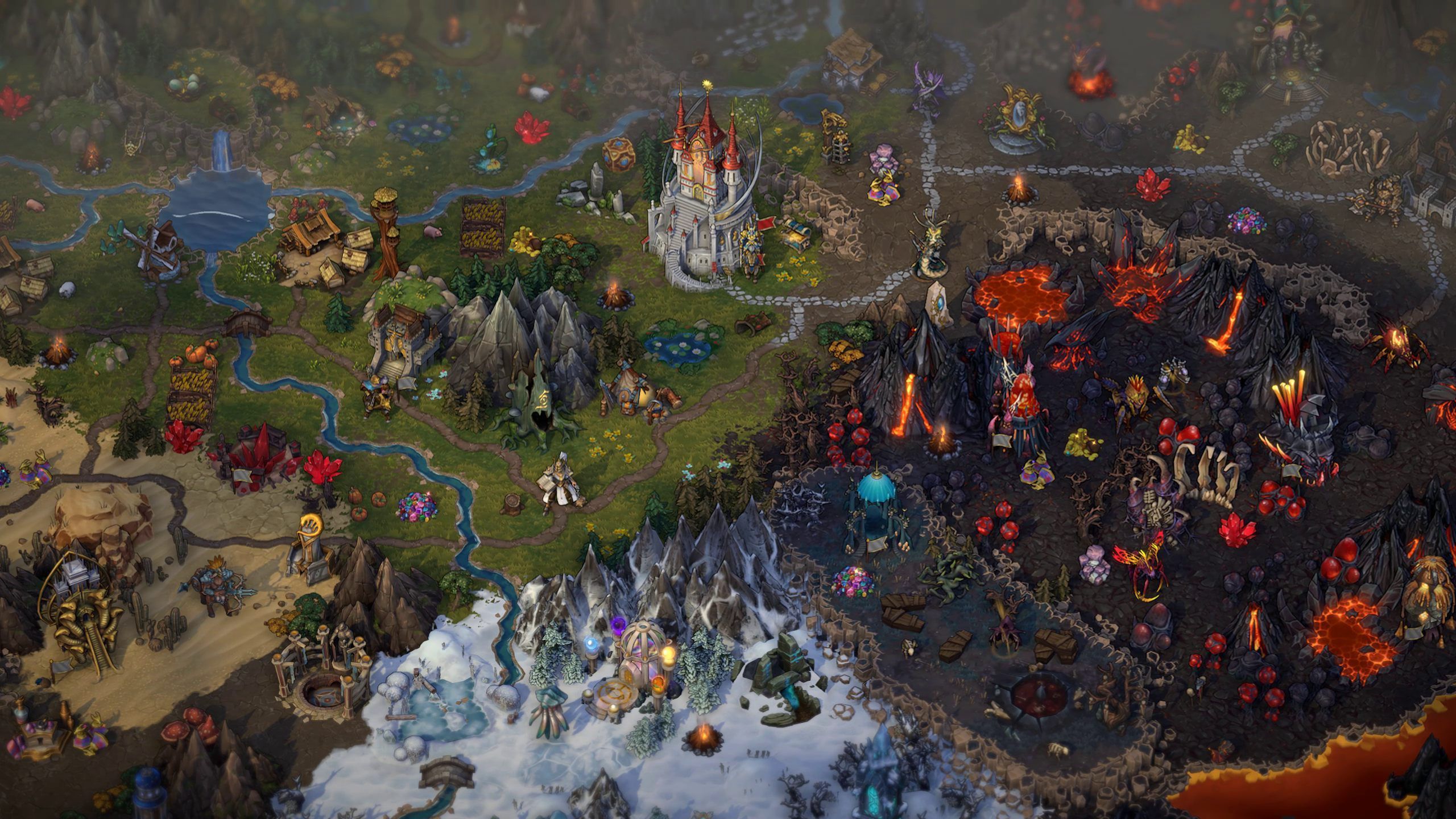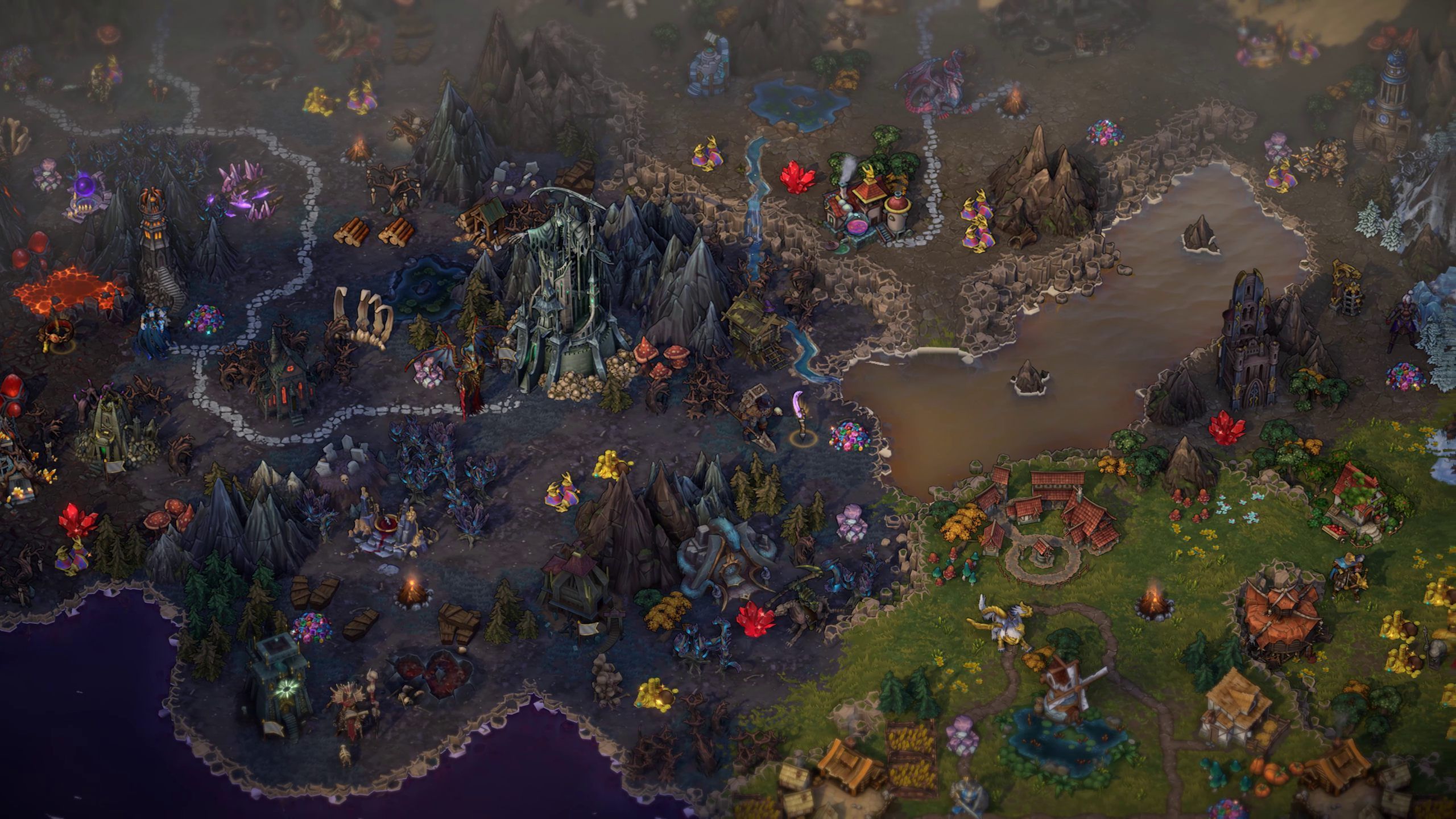 Przed wyruszeniem w drogę zebrałem drużynę, tj. zatrudniłem kolejnego bohatera i pożyczyłem sobie jego armię, zostawiając mu samotnego mackostwora, a następnie ruszyłem na podbój. Jeśli śledzicie rozwój gry, z pewnością widzieliście, jak odkrywaniu mapy towarzyszy wizualny efekt jej wypalania. Wszystko, co nieznane, pozostaje szarością, a w miarę pomykania na naszym koniku coraz więcej świata gry staje się kolorowe. Twórcy podzielili się informacją, że jeśli ktoś woli swoją mgłę wojny jako bezkresną gwiezdną pustkę a la Heroes of Might and Magic III lub białe chmurki jak w „piątce”, będzie mógł dostosować ten efekt do własnych preferencji. A skoro o UI mowa, ikony bohaterów znalazły się po lewej, ikony miast po prawej, a pasek zasobów w górnej części ekranu. W lewym górnym rogu mamy natomiast panel czarów oraz praw.