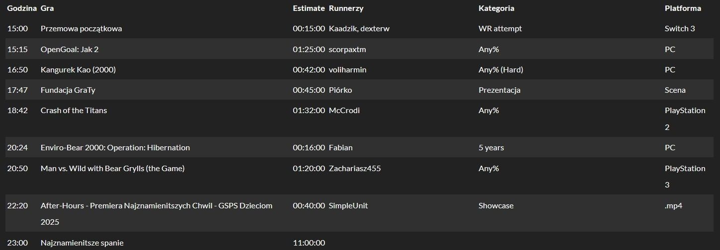 Oficjalny harmonogram speedrunów i transmisji jest już dostępny w serwisie horaro.org, a poniżej zobaczycie rozkład jazdy przewidziany na dziś: