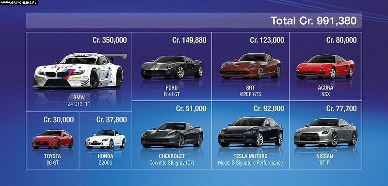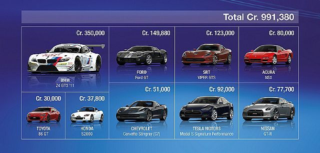 Producenci zapowiedzieli dziś na oficjalnym blogu PlayStation, że gracze będą mogli zakupić w formie DLC wirtualną walutę gry, którą można wymienić na auta oraz ulepszenia. Opcja ta przeznaczona jest dla osób, które nie mają ochoty spędzić wielu żmudnych godzin rozgrywki, by uzbierać odpowiednią sumę punktów, pozwalającą na otrzymanie dostępu do ulubionych modeli samochodów lub części i ulepszeń. Paczki z punktami będą zawierały 500 tysięcy, 1 milion, 2,5 miliona oraz 7 milionów kredytów. Ich cena nie jest na razie znana. Na załączonej grafice możemy zobaczyć przykład tego co możemy kupić w grze, korzystając z miliona kredytów.