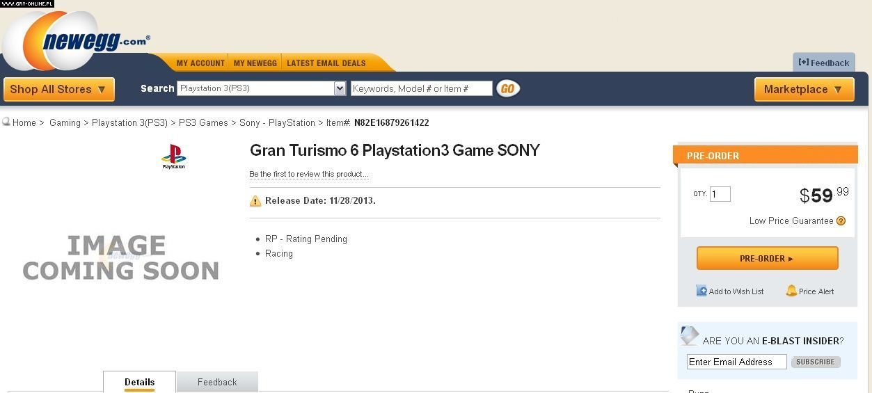 Sklep internetowy Newegg.com przyjmuje zamówienia przedpremierowe na grę Gran Turismo 6. Sprzedawca twierdzi, że tytuł trafi na konsolę PlayStation 3 pod koniec listopada bieżącego roku.