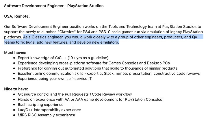 Jako dowód, że nie jest to sprawa przedawniona, a Sony nie zamierza ograniczać się do tego, co już oferuje, niech posłuży świeże ogłoszenie o pracę, zauważone na portalu LinkedIn.com przez użytkowników forum ResetEra. Jasno wynika z niego, że firma szuka nowych ludzi do działu „Narzędzia i Technologie”, którzy zajmowaliby się pozycjami z katalogu klasyki PS Plus Premium. Zatrudnieni mieliby „dodawać nowe funkcje i opracowywać nowe emulatory”.