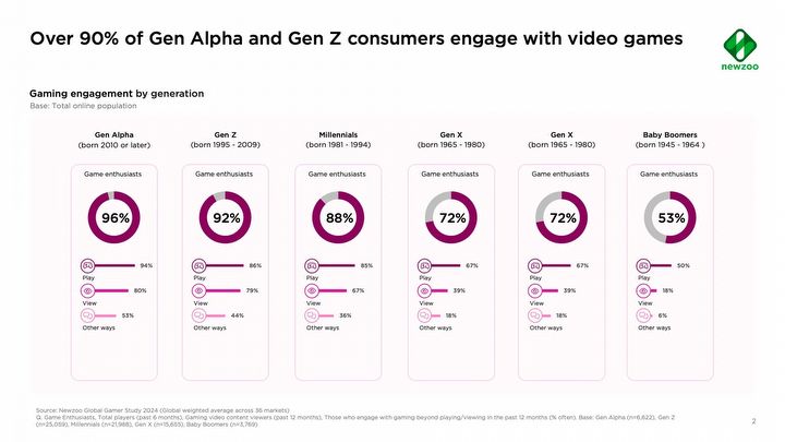 Dane zebrane przez Newzoo pokazują, że 53% osób urodzonych w latach 1945-1964 „angażuje się” w gry wideo. Miejcie przy tym na uwadze, że przez „zaangażowanie” twórcy raportu rozumieją, że w ciągu 12 miesięcy dana osoba albo samo grała, albo wykonała aktywność powiązaną z grami wideo: np. oglądała podcasty lub materiały, rozmawiała o nich z bliskimi itd. Niemniej 50% z nich miało przynajmniej raz w roku samodzielnie zagrać w jakąś produkcję.