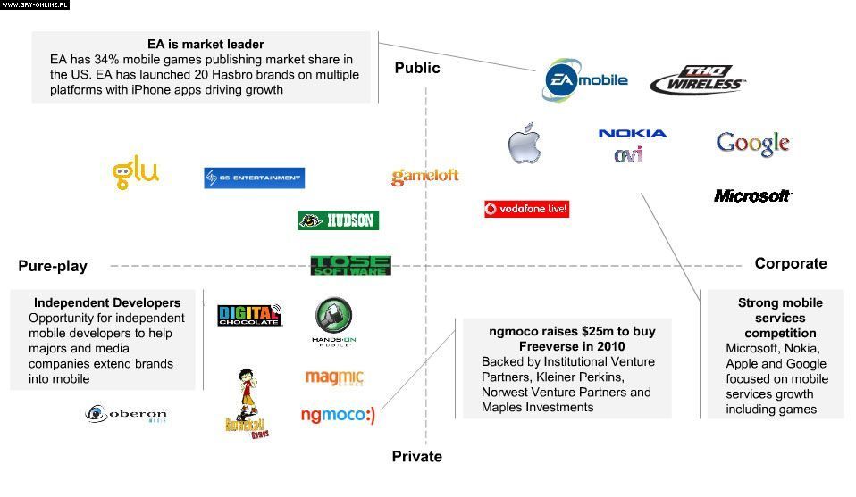 2. Sektor gier mobilnych to obszar wykazujący wysoki wzrost możliwości inwestycyjnych, jednakże duże firmy na razie nie mają pozycji na tym rynku. Wiąże się to między innymi z faktem, że zwykle lokują one zasoby na potrzeby dużych, drogich, skomplikowanych projektów wysokiego ryzyka, podczas gdy segment mobilny wymaga inwestycji innego typu – szybkich, wieloplatformowych i lokalnych.