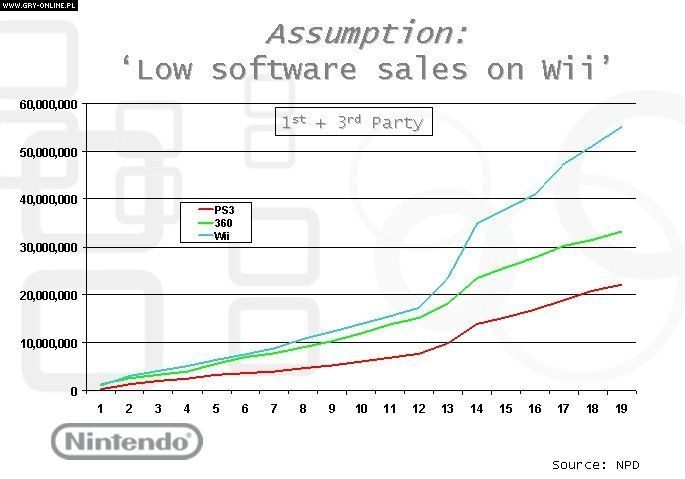 Błędny ocena sytuacji mogła się brać również z faktu, iż w przypadku konsol Xbox 360 i PS3 gry tworzone przez firmy trzecie stanowią około 80% ogólnej sprzedaży, podczas gdy w przypadku Wii jest to jedynie 56%. Jednak sprzedaż gier na Wii jest tak wysoka, iż nawet to "marne" 56% stanowi całkiem pokaźną liczbę. Dla porównania poniżej wykres przedstawiający ogólną sprzedaż gier w analogicznym okresie co powyżej, czyli pierwszych 19 miesiącach bytności na rynku każdej z konsol.