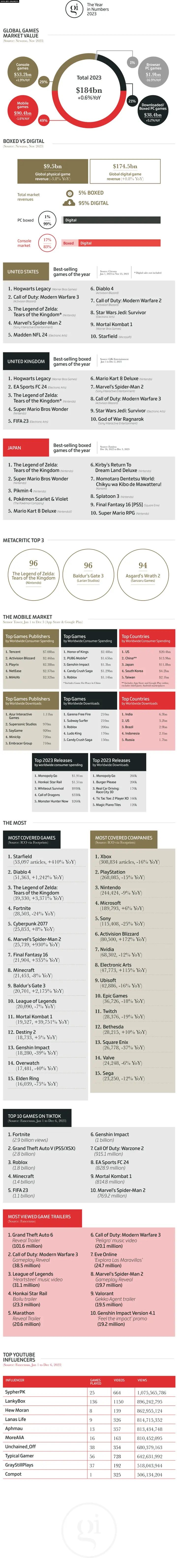 Ogólnie rynek gier poradził sobie podobnie jak rok temu, generując 184 miliardy dolarów przychodu (co GI.biz podaje jako wzrost, choć na infografice sprzed roku widnieje 184,4 mld dol.; być może redakcja odniosła się do danych z całego roku, podczas gdy oba podsumowania oparto na statystykach do listopada).