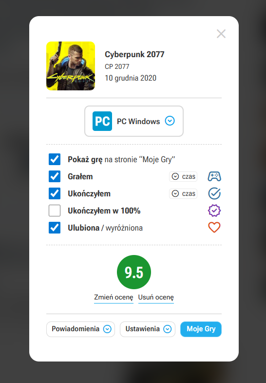 Ikona oczka, o którą wielu z Was pytało przed miesiącem, w końcu pełni funkcję, do jakiej została zaprojektowana. Po kliknięciu w nią na dowolnej stronie serwisu otworzy się specjalny panel, pozwalający na dodanie wybranej gry do swojej kolekcji. Możecie tam określić, czy chcecie w nią dopiero zagrać, czy może już ją ograliście (i w jakim stopniu, ile zajęło Wam jej przejście itp.). Również z tego miejsca możecie ocenić grę, zmienić ocenę lub po prostu ją usunąć (tak, wprowadziliśmy właśnie opcję usunięcia swojej oceny gry – for your pleasure), jak również włączyć powiadomienia na jej temat.