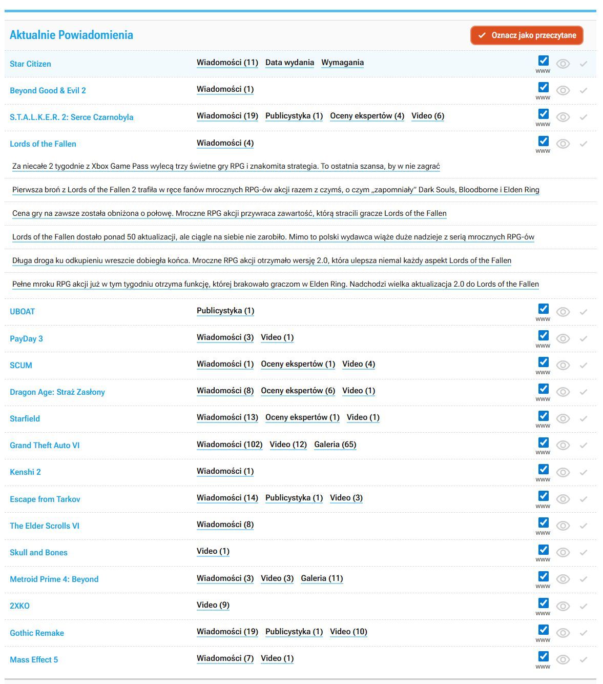 Obecnie działają tylko powiadomienia w obrębie strony GRYOnline.pl, ale na początku przyszłego roku dodamy opcję powiadomień mailowych i (tutaj zaznaczam – być może) push.