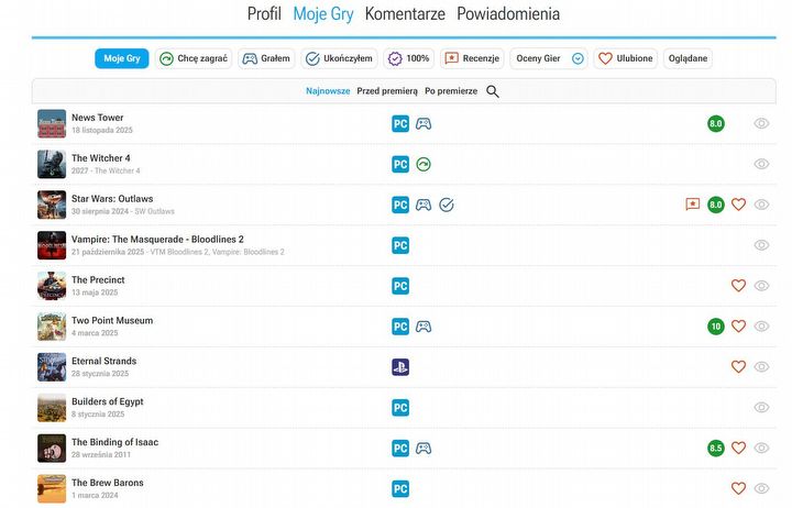 Zmienił się też wygląd strony „Moje gry”. Możecie przeglądać swoje gry, dowolnie personalizując listę, np. według tytułów, które już ukończyliście bądź w które po prostu zagraliście, czy na przykład według wystawionych ocen. Jest też wyszukiwarka oraz opcje sortowania wyświetlanych gier przed i po ich premierze. Generalnie zapraszam do korzystania i podzielenia się własnymi uwagami oraz spostrzeżeniami. Na pewno weźmiemy je pod uwagę, wprowadzając kolejne zmiany i poprawki.