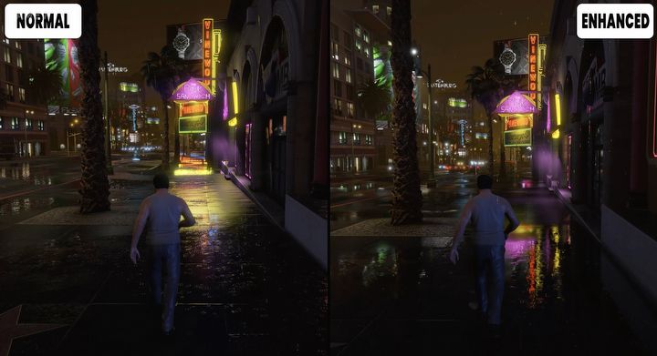 Na kanale YouTube użytkownika GameV pojawiło się szczegółowe porównanie obu wersji gry pod kątem oprawy graficznej (możecie je obejrzeć powyżej). Komentarze pod materiałem są jednak dalekie od entuzjastycznych – wielu graczy twierdzi, że różnice wizualne są minimalne, a w niektórych przypadkach wersja „Legacy” wypada ich zdaniem lepiej. Krytykowana jest chociażby jakość renderowania w nowej edycji – niektórzy użytkownicy zauważyli, że np. spacery po mieście nocą w deszczu wyglądają bardziej klimatycznie w GTA V Legacy (screen poniżej).