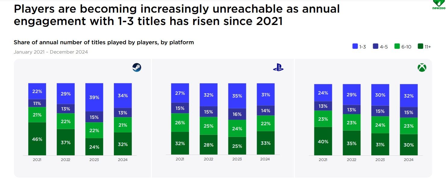 Dzieła będące na rynku od 1 roku do 5 lat, mieszczą się w 32%. Najnowsze wydania, choćby EA Sports FC 25 czy Call of Duty: Black Ops 6, stanowią natomiast jedynie 12%. Warto zaznaczyć, że wszystkie powyższe liczby związane z czasem grania nie odbiegają za bardzo od wyników z 2023 roku zaprezentowanych przez Newzoo.