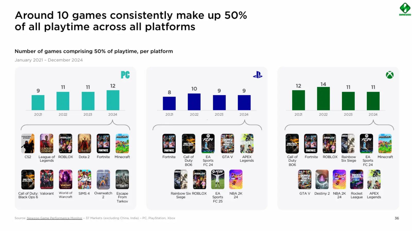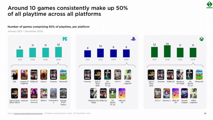 Nie zmieniło się także to, iż przywołane wyżej serie EA Sports FC oraz Call of Duty są częściej ogrywane na konsolach. Poniżej znajdziecie grafikę prezentującą gry, które były najpopularniejsze na danej platformie w 2024 roku. Co ciekawe, względem 2023 r, znacząco wzrósł tzw. „playtime” na urządzeniach PlayStation (o 21%).