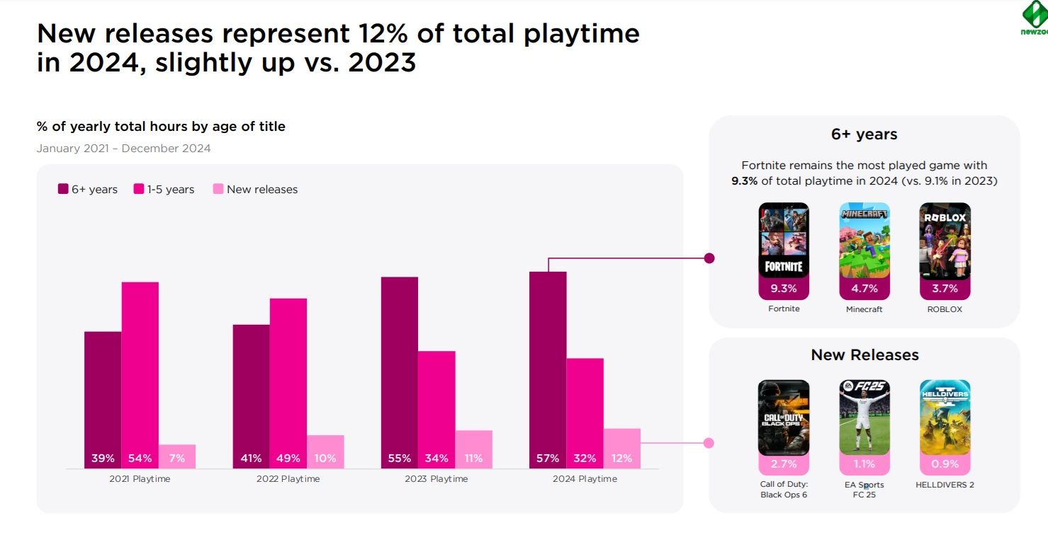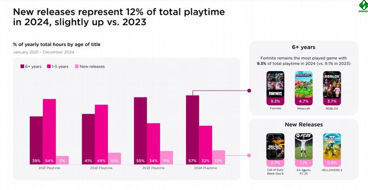 Interesująco prezentuje się także czas ogrywania poszczególnych produkcji w 2024 roku. Fani zdecydowanie wolą starsze tytuły, wydane co najmniej 6 lat temu – stanowią one 57% wszystkich gier, w których spędzaliśmy wolną chwilę. Zaliczają się do nich m.in. Fortnite (9,3%), Minecraft (4,7%) i Roblox (3,7%).