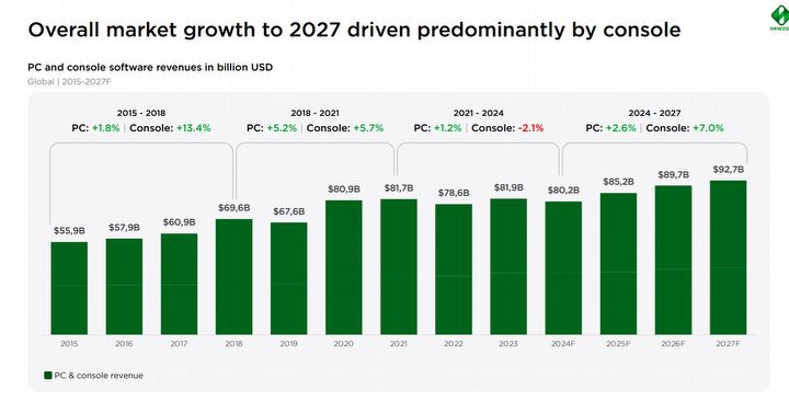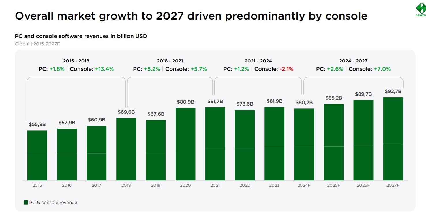 Ukazał się świeży raport The PC & Console Gaming 2025, przygotowany przez firmę Newzoo. Z prawie 100-stronicowego dokumentu możemy dowiedzieć się kilku ciekawych rzeczy o branży gier wideo – choćby tego, jak w kolejnych latach zwiększy się jej wartość.