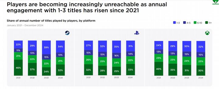Ponadto z raportu wynika, że od 2021 roku gracze ogrywają coraz mniej tytułów. Zazwyczaj poprzestają na 1–3 wybranych produkcjach. Duże powody do zmartwień może mieć Microsoft, ponieważ to właśnie w przypadku Xboxów najlepiej widać tę zmieniającą się tendencję.