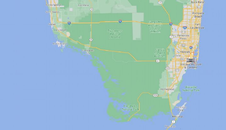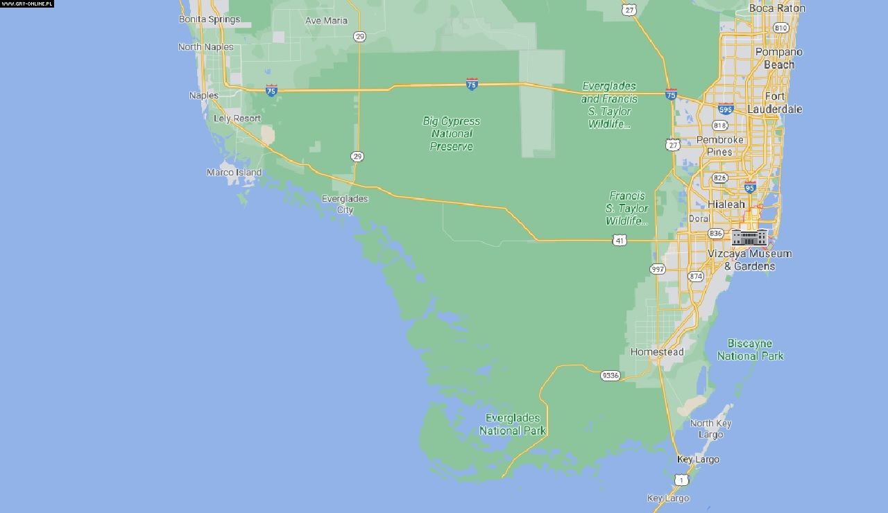 Widoczny na nim obszar to niewątpliwie południowa część Florydy – porównajcie go sobie z rzeczywistą mapą (screen poniżej). Na północnym wschodzie rozciąga się miasto Miami, które posłużyło jako tytułowa lokacja GTA: Vice City i Vice City Stories. Na południu znajdują się zaś tereny mniej zurbanizowane, w tym chyba zaznaczone ciemnozieloną barwą mokradła. Całość nieco się różni od stanu faktycznego – choćby linia wybrzeża jest inaczej ukształtowana – ale o braku podobieństwa nie może być mowy.