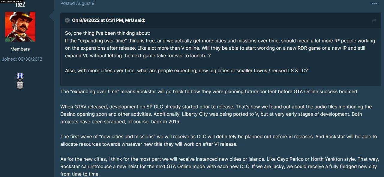 […] Rockstar powróci do tego, jak planował dodatkową zawartość przed sukcesem GTA Online. […] Pierwszy rzut „nowych miast i misji”, które wejdą w skład DLC, z pewnością zostanie zaplanowany przed premierą GTA VI. Dzięki temu Rockstar będzie mógł oddelegować część deweloperów do pracy nad nową grą, gdy szóste GTA zostanie już wydane.